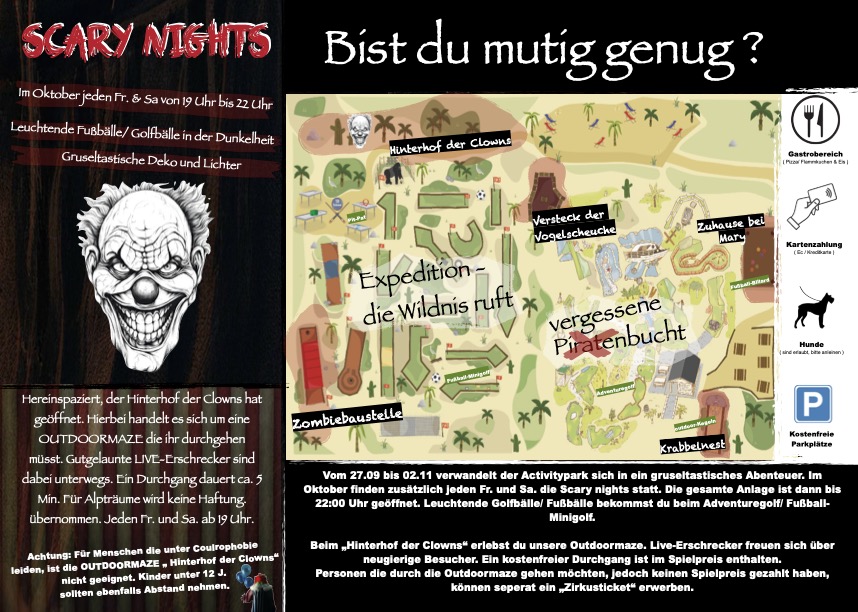 Info: Das Betreten der Aktivitäten ist kostenpflichtig, auch für Begleitpersonen. Personen die unsere Anlage besuchen möchten ohne zu spielen, können gerne unsere Terrasse nutzen. Ein Bistro befindet sich direkt vor Ort.
